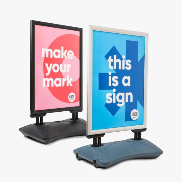 Premium stoepbord met watertank en klikframe. Dubbelzijdig te gebruiken, weerbestendig en eenvoudig te verplaatsen. Verkrijgbaar in A1 en A0, in zwart of grijs.
